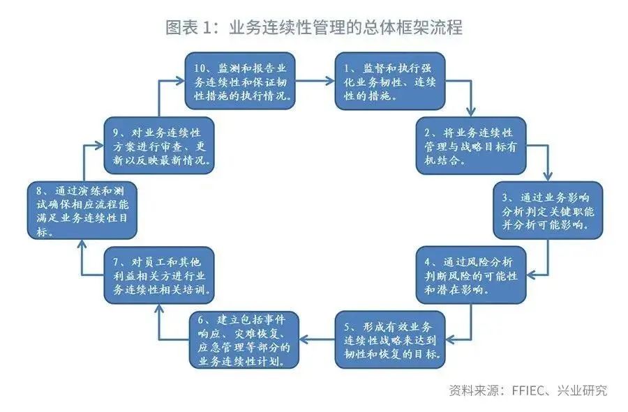 《手册》指出,金融机构的业务连续性管理流程应形成从设定目标、风险分析、构建业务连续性计划、培训与测试直至检测与更新的有机闭环。《手册》将业务连续性的管理分为了10个步骤,具体为:一是管理层对于金融机构整体业务韧性、业务连续性和应急响应能力的监督和执行。二是将业务连续性管理的各个要素与机构战略目标等进行有机结合,使得业务连续性管理的目标、措施符合金融机构的特性和目标。三是通过业务影响分析(Business Impact Analysis)来确定关键业务职能(Critical Functions),分析与其他机构和企业的关联性,并评估影响。四是通过风险评估来识别确定风险、评估不同风险造成的业务中断的可能性和潜在影响。五是构建有效的业务连续性策略(Business Continuity Strategy)来确保业务韧性和恢复目标的实现。六是在前期分析和研判的基础上,基于业务连续性策略形成完备的业务连续性计划(Business Continuity Plan),其中包括事件响应(Incident Response)、灾害恢复(Disaster Recovery)以及危机管理(Crisis/Emergency Management)等组成部分。七是针对员工和其他利益相关方进行业务连续性的培训。八是通过演练和测试确保业务连续性相关流程能够有效支持此前建立的目标。九是对业务连续性策略、计划等进行整体的审查和更新,以此来反映最新的业务和市场情况。十是监测并同时向管理层汇报业务连续性管理的整体情况。