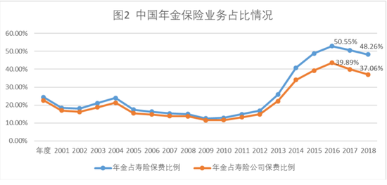 根据图2可以看出,年金保险在寿险保费中的占比基本维持在50%左右,在寿险公司保费中的占比约为40%。