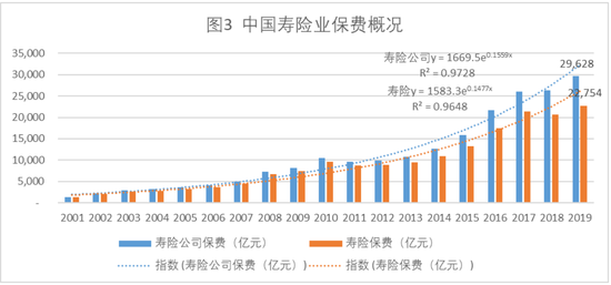2019年,寿险公司实现保费收入29628亿元,同比增长12.82%;寿险实现保费收入22754亿元,同比增长9.80%。图3给出了2001年至2019年的寿险公司保费和寿险保费情况,