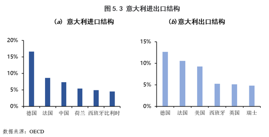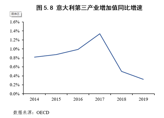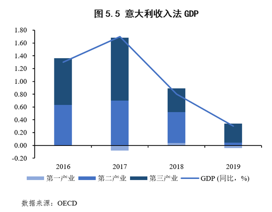2019年意大利GDP仅增长0.3%,是2016~2019年的最低值,其中最终消费拉动0.2个百分点,资本形成拉动-0.4个点,净出口拉动0.5个点,投资拖累经济增长,而净出口是拉动增长的主要动力。往前追溯三年,从2016~2019年意大利支出法GDP看,消费是经济增速的重要支撑,但也已经呈现下滑趋势,家庭消费与政府消费增速同时下滑,反映意大利总需求的不足;投资连续三年拖累经济增速,主因意大利受欧盟严格财政限制和本国投资效率偏低影响;净出口是拉动意大利经济增长的关键因素,特别是近年来意大利出口增速主要由服务贸易支撑,货物贸易增速持续下行,也从侧面反映出意大利制造业较为低迷,但旅游餐饮等服务业对海外游客的吸引力强。