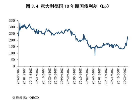 (4)意大利德国10年期国债利差快速上升。2020年2月后意大利德国10年期国债利差持续快速上升,3月14日上升至230.7 bp,意大利与德国国债利差的走阔表明投资者对意大利衰退风险的担忧,市场资金流向更为避险的德国国债。疫情冲击降低意大利的财政收入、增加财政支出,对债务率已经高企的意大利而言,债务违约风险上升,国债利率预计维持高位震荡。