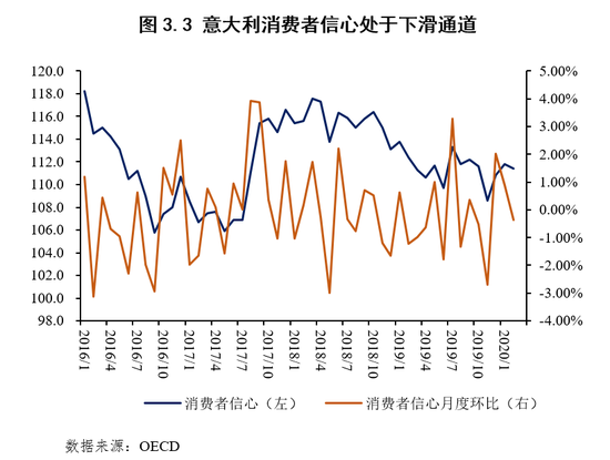 (3)消费者信心持续下滑。2020年2月意大利消费者信心指数111.4,较上月环比下滑0.36%,自2018年一季度后意大利消费者信心处于下滑通道,家庭消费对GDP的拉动作用持续下滑。新冠肺炎不仅直接延缓或降低家庭消费意愿,还将因经济放缓导致工资收入下滑、失业率上升,预计意大利消费者信心会延续下滑趋势,消费的恢复需强力的财政政策支持。