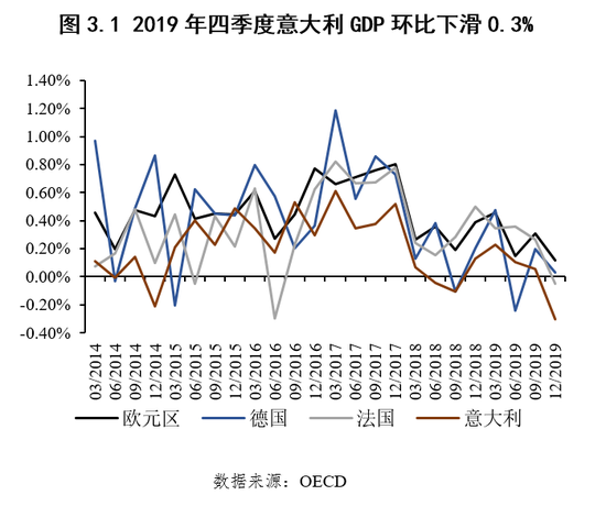 (1)意大利2019年四季度GDP环比下滑0.3%,创下自2013年一季度以来最大季度环比降幅。内需不振、投资不足、对意大利政府政策缺乏信心共同导致2019年意大利经济低迷,全年仅微弱增长0.3%,四季度GDP更是出现了萎缩。