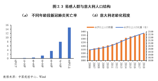 意大利人口结构老龄化明显,易感人群比重高,进一步加重意大利医疗体系的压力。意大利在全球人口老龄化国家中排名第二,65岁以上老年人口占人口总数的23%,属于人口严重老龄化国家。老龄人口受新冠疫情影响更重,预期可能会有更多的重症患者,这也是意大利新冠肺炎患者死亡率高达6%以上的原因。高度老龄化不仅增加意大利的易感人群比重,而且重症患者数目众多也进一步考验意大利的医疗体系承载能力。