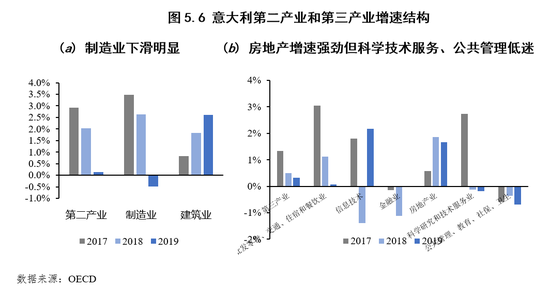 从三大产业拉动看,意大利第一、二、三产业分别占比2%、24%和74%,经济增长主要靠第三产业拉动,2019年第一产业拉动-0.04百分点、第二产业拉动0.04个百分点、第三产业拉动0.3百分点。从2016~2019年意大利收入法GDP看,第三产业是稳住经济增速的关键:第一产业占比过低且基本负增长,第二产业占比高,但2016年后增速处于下滑通道,特别是制造业增速持续下滑,建筑业仍能保持增长,第二产业对经济的拉动作用逐年降低;第三产业占GDP比重高,在经历2017年的下滑后,2018~2019年增速保持稳定,特别是房地产、信息技术增速较快,不过金融业增速较低。综合制造业和服务业的增速情况,建筑业和房地产业的增速稳定,而制造业、住宿餐饮、公共服务类产业已经出现下滑,这也反映出意大利经济结构的脆弱性较高。在疫情冲击下,预计制造业和服务业均将受到较大冲击。