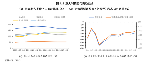 意大利政府和私人债务均较高,叠加欧盟严格财政限制,财政空间有限。从2018年意大利各项债务占GDP比重来看,私人债务占到了GDP比重的166.2%,中央政府和一般政府的债务占GDP比重分别为134.8%,非金融公司债占GDP比重为112.6%,家庭债务占GDP比重为53.6%。从债务结构上可以看到,意大利私人、公司和政府债务比例已经较高,未来如果再次扩表,只能选择相对负债率较低的家庭科目。同时,较高的负债比例意味着对外部冲击的抵御能力较差,外部危机带来的收入减少可能会影响高负债部门的正常还本付息从而形成违约。