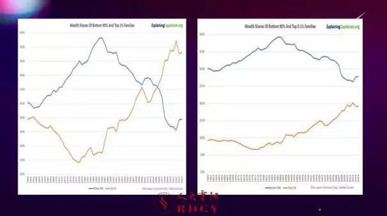 西方过去的四十多年里一直在经历着经济金融化的过程,这使得所有经济过程能够表现在金融市场的种种数据中。这里涉及一个问题,传统上我们所说的人民群众的生产生活问题到底是怎么样的?这两幅图,左边的这一幅图表示的是美国的家庭财富排名前1%的家庭(黄线)和后90%的家庭(蓝线)所占财富比例随时间的变动。我们能够看到在这里,目前来讲前1%的家庭拥有的财富已经远远要高于后边90%家庭拥有的财富。