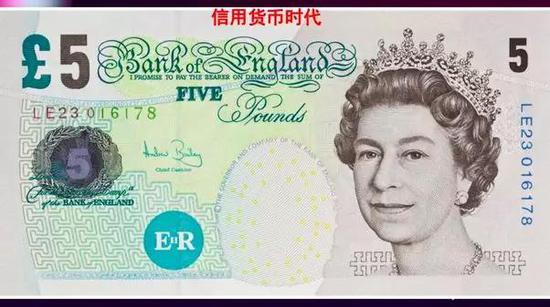 我们要在信用货币制度的背景下对全球股市的暴跌进行理解,这是第三层理解。信用货币时代可以通过什么来理解?我们看这张图,这是一张5英镑钞票的正面。在英国女王伊丽莎白二世的头像左侧有一行字,翻译为,“我承诺(伊丽莎白女王二世承诺)持有的人一旦请求,我就会付给他五英镑”。意思是说,如果你拿着一张五英镑去跟伊丽莎白女王二世说,我请求兑现,那英国女王伊丽莎白二世就会给你另外一张五英镑。信用货币以国家信用为基础进行流通,这就是信用时代的特征。