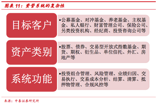 多元化投资带来的系统集成需求。1、综合运用多种金融工具。欧美金融市场的成熟度较高,金融产品丰富,除了常规的股票和债券,还有各种金融衍生品可用于资产配置或风险对冲。2、全球化资产配置。资产配置的大类资产种类在增加,海外投资的比重将持续提升,尤其是亚洲的新兴市场。资管公司需要增加海外投资的业务模块。3、另类投资占比提升。随着养老金等长期资金入市,叠加二级市场获取超额收益的难度增加,资管机构通过配置另类资产来获取超额收益,包括流动性较低的房地产、股权投资、实物投资等,其投资模式和管理方式与传统的资管有所区别,需要增加相应的业务模块。系统集成能实现资管机构对投资组合的全面管理,及时对投资组合进行风险评估及调整操作。