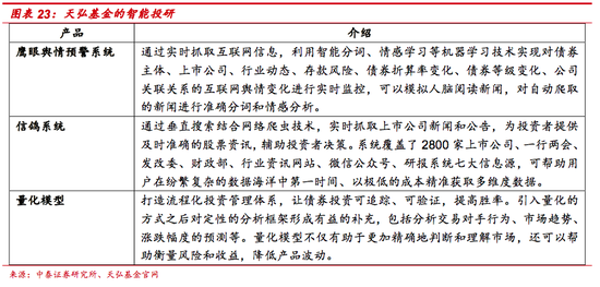 智能投顾布局。1、产品。2015年天弘基金推出了“容易宝”系列指数基金,涵盖宽基指数、主题、行业、策略的19只指数基金产品,加上天弘基金旗下货币基金、债券基金(天弘基金旗下现有5只货币基金、8只债券基金),为智能投顾服务提供了非常便利和清晰的工具池。2、系统。打造新用户中心,将多渠道账户进行整合的系统。新用户中心整合了过去离线TA中的账户业务,使得账户开户从过去的T+1确认提升到T+0实时确认,更好地支持创新业务。该系统还通过对用户进行更全面的画像刻画,为不同客户提供差异化服务,实现“千人千面”的产品销售和推荐。3、渠道。包括公司的直销平台和第三方销售平台,陆续和蚂蚁聚宝、雪球和牛股王等平台合作专属的投资策略及产品服务。
