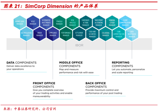 资产管理的系统集成服务商可归类于金融IT公司,主要提供与资产管理相关的系统产品。由于资产管理系统的客户差异大、功能模块多,产品交付具有系统集成的属性。1、目标客户。海外资产管理行业的生态十分丰富,除了大型的资产管理机构,还有各种规模不一、需求各异的资产管理公司,包括不限于公募基金、对冲基金、养老基金、主权基金、私人银行、财富管理公司、保险公司、另类投资机构、经纪商、投资咨询公司等,覆盖资产所有者、资产管理人、交易商、投资顾问等市场角色。2、产品体系。基于来自不同类型客户差异化的需求,资产管理系统的复杂度较高。一是产品维度,系统需要支持各种资产类别,从常见的股票、债券、交易型开放式指数基金到期货、期权、衍生品、单位信托、外汇、房地产等,需要打通各种外部交易系统并建立各种资产类别统一管理的平台;二是功能维度,系统要覆盖投资管理的全流程,包括前台、中台和后台,涉及投资组合管理、风险管理、业绩归因、交易执行、交易成本分析、结算、清算、抵押物管理、合规风控等职能。