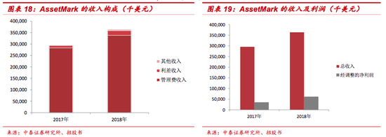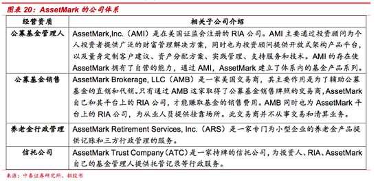 公司体系。AssetMark是服务财富顾问的综合性平台,同时也是牌照齐全的资产管理公司。AssetMark的公司体系包括公募基金管理人,公募基金销售,养老金行政管理,信托公司四家牌照公司。这些金融牌照确保AssetMark可以为财富顾问提供全流程的服务,建立完整的生态体系,丰富收入来源。
