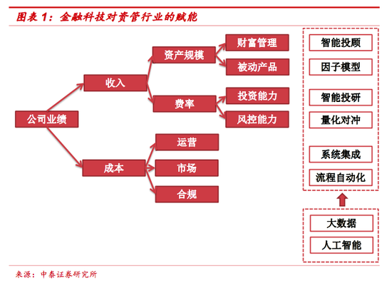 自身发展需求。资管公司的目标是做大资产规模,提升营收能力。要实现这一目标的方式包括提升投资业绩,提高运营效率,降低运营成本,改善用户体验等。金融科技的应用主要表现在系统的整合、数字化转型和流程优化、大数据及人工智能的运用来提高投资能力及客户运营能力。