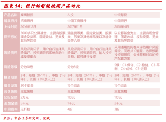 银行的智能投顾主要以公募基金作为底层资产、根据客户的投资期限和风险偏好进行组合配置,实现一键购买、调仓和赎回。目前推出智能投顾的银行主要包括招商银行、工商银行、中国银行、浦发银行、中信银行、兴业银行、广发银行、平安银行等。国内银行的智能投顾产品处于发展早期,尚未能实现千人千面的投资组合,一方面,对于个人投资者的风险收益属性描述要更精细化,另一方面,资产配置的金融工具有待丰富。