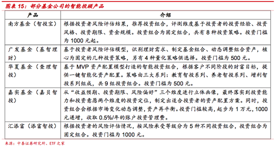 公募基金的智能投顾提供自家基金产品的投资组合,除了根据客户的风险属性进行资产配置,客户也可以选择特定的投资策略组合。相比银行的智能投顾,基金公司的产品门槛更低,但定制化能力和智能化水平较低。目前推出智能投顾的基金公司主要包括南方基金、广发基金、华夏基金、嘉实基金、汇添富基金等。