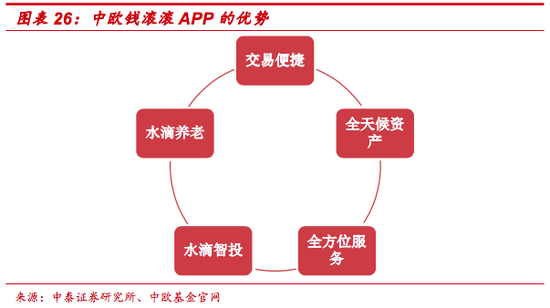 “水滴智投”系列服务由子公司中欧钱滚滚提供系统支持。“水滴智投”定制了一整套策略和服务的构建,从金融产品的精选、个性化的配置方案、到投资后的持续服务。中欧钱滚滚通过技术将这些服务系统化、标准化,降低成本的同时又能为客户提供个性化的服务。未来这些服务不仅提供给中欧客户,还能以标准接口输出给合作伙伴,共同服务互联网客群。