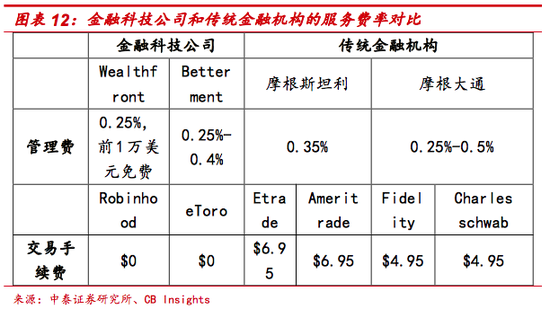 智能投顾是针对个人投资者的投资工具,提供低成本的交易工具或根据个人风险偏好、理财目标自动进行资产配置。智能投顾运用了自动化流程、大数据、人工智能等技术降低了投资理财的成本,低费率、低门槛、互联网化是智能投顾的主要特征。两种模式:1、交易类:金融科技公司采用低价策略。美国传统金融机构的服务门槛较高,金融科技公司采用低价策略吸引客户。但该策略的有效性有限,传统金融机构可推出类似的产品,如Vanguard就取消了绝大部分ETF产品的交易手续费。2、资产配置类:金融科技公司将年轻人群作为目标客户,提供简单易懂的自助理财规划工具。