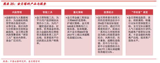 金贝塔。金贝塔成立于2014年,是基金公司探索互联网金融的重要尝试,目前公司的业务重心已经转移到B端服务,为金融机构提供综合化的解决方案。公司提供的产品和服务包括风险管理、智能工具、量化策略、股票组合及投资者教育。