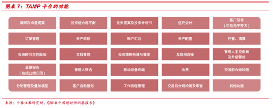 TAMP的功能模块。TAMP平台主要帮助财富顾问完成耗时耗力的后台工作,具体包括投资研究、投资经理的尽职调查、投资组合构建、投资组合调整、账务核对、业绩报告、税务规划以及会晤准备等。TAMP平台的系统模块包括理财规模、客户管理系统、计划书生成、交易、投资产品筛选、风险管理、自定义报告、账户整合、投资经理研究及尽职调查等。