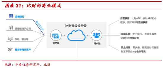 客户端布局。公司以自有APP和小程序获客为主,其他金融机构及非金融场景合作为辅。根据不同的目标客群,开发了不同的APP和小程序。1、比财APP主要面向一二线城市、对理财有一定认知的大众客户,每种投资期限会显示多个产品,由客户自行选择,不同客户对银行品牌的认知会有差别。2、拼财APP和小程序面向低线城市的下沉人群,类似于拼多多的社交模式,每种投资期限显示一只收益最高的产品,通过微信社交传播,降低理财入门门槛。3、亚财APP主要针对高净值人群,提供海外资产配置,目前主要是香港。
