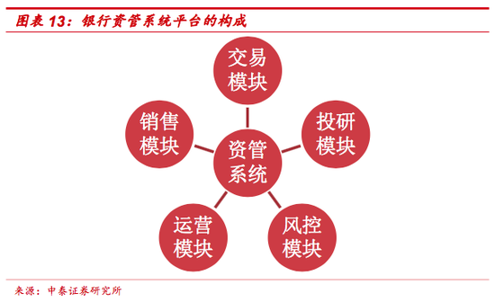 商业银行在资管科技上的布局以系统建设为主,优先考虑风险管理模块。银行理财子公司的新设给银行资管系统的建设带来契机,可以摆脱历史包袱,从底层开始建设,采用最新的技术方案,包括中台战略和微服务架构等,按照大类资产配置的发展要求进行开发。大型资管公司应重点打造一体化的资管平台。在平台上集成投研、产品设计、交易、销售、客户管理、风控等功能,以标准化的接口向企业内部各部门及外部合作伙伴输出,支持前台多渠道服务,重点打造移动端服务平台,前端围绕客户需求提供智能化的财富管理服务。银行资管的体量大、品类多,在业务开展过程中应重点考虑风险管理和成本控制,不应以获取超额收益作为主要目标。因此在体系开发时目标一致,通过系统设置优化业务流程,降本增效;优先布局风控模块,结合大数据和人工智能技术及早识别分享、化解风险。