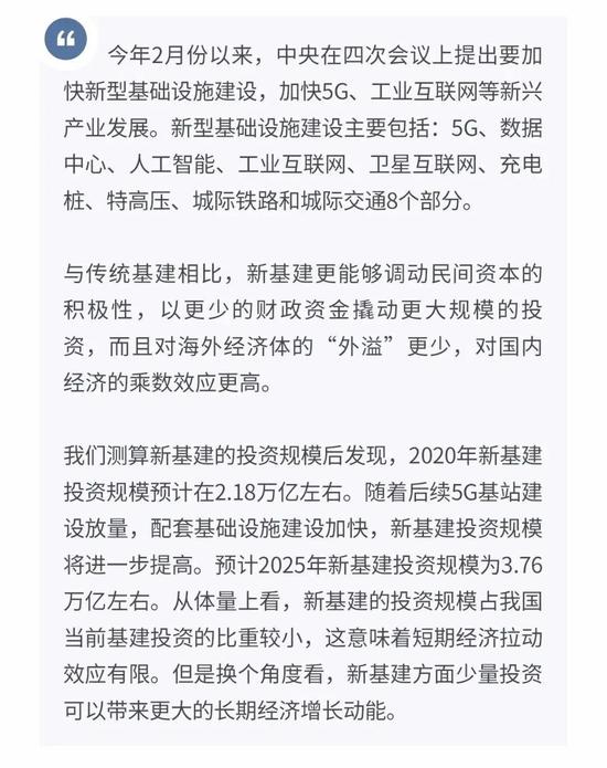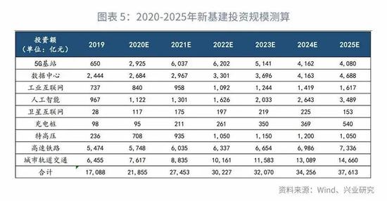 通过对新基建8个重要类目的分项测算,2020年新基建的投资规模预计在2.18万亿左右。后续随着5G基站建设放量,配套基础设施跟进建设加快,新基建年投资规模将快速增长,预计到2025年当年的投资规模或达到3.76万亿。