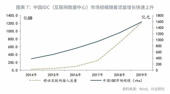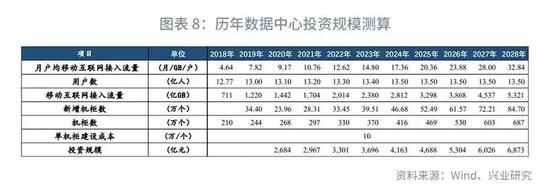 从过往数据看,IDC市场规模与互联网流量增长存在明显的正相关关系。我们将移动互联网接入流量与全国数据中心机柜数进行回归,结果显示:移动互联网接入流量每增长 1 亿 GB ,将带动数据中心机柜数增长 1081 个。通过估算移动互联网接入流量的增长规模,即可测算数据中心未来的投资规模。