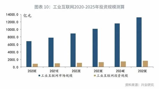 工信部数据显示,2018年我国工业互联网市场规模已经达到5813亿元左右。根据前瞻产业研究院的测算结果,其预估2019年中国工业互联网市场规模在6000亿元左右,未来五年有望实现13%的年复合增长率 [6] 。赛迪顾问的分析亦显示,2020-2022年中国工业互联网市场将以14.4%的年均复合增长率稳定增长 [7] 。因此,我们将以市场规模增量来预估工业互联网市场的投资规模,并且以14%的年均复合增长率计算。其投资规模测算结果如下:
