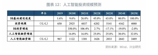 而这两个限制因素在未来2-3年可能仍将存在,人工智能投资在政策呵护下或温和增长。增长率方面,我们选取2015-2019年高技术产业的年复合增长率16%。后续,随着5G组网完成、工业互联网规模提升,AI技术或取得突破,带动人工智能企业融资重新快速增长,将适当调高投资增速。因此,我们对于人工智能投资规模预测如下: