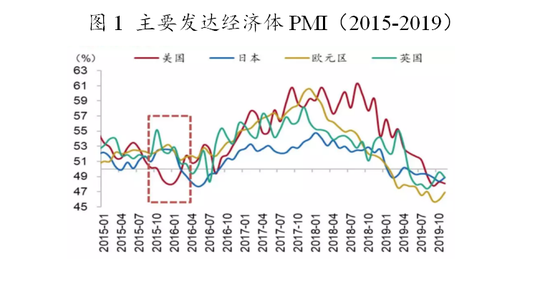 (一)全球经济早已呈现疲态。西班牙《公众报》网站17日刊文称,2019年最后一个季度,全球债务总和与国内生产总值(GDP)总和之比增至322%。只需要中等程度的衰退,就将导致超过19万亿美元的资本主义企业债务出现大面积违约。如图1所示,从PMI指数看,全球经济在2015年有一次共同的下跌,虽然随后两年有所回升,但到2018年整体下滑的趋势至今没变,主要表现出全球贸易萎缩、投资增长滞缓、贸易保护主义抬头、全球性创新不足等。考虑到2019贸易战和美国反全球化趋势的加剧,全球经济衰退早已趋势明显。