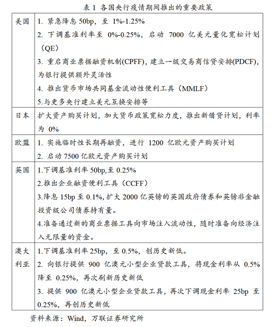 根据万联证券研究所(表1)所整理的各国央行疫情期间重要政策来看,各国中央银行“大开水龙头”的倾向已经比较明显。虽然近期的国际金融风险与疫情的爆发速度超出全球大部分国家预期、国际原油价格跌幅过大和美国股市频繁熔断有关。但是,回看2008年以来全球央行普遍采取的量化宽松政策持续推高了资产价格,再加上之前所提及的全球债务泡沫的迅速扩张以及贸易战等逆全球化行为增加对国际市场预期的破坏等,即使没有新冠疫情,之前的全球经济问题也已经逐步将全球市场信心推向了崩溃的临界点。