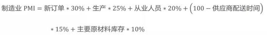 制造业PMI综合指数由生产、新订单、从业人员、原材料库存、供应商配送时间五个扩散指数加权平均而得: