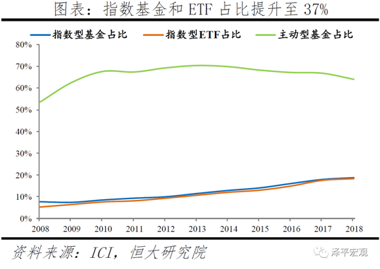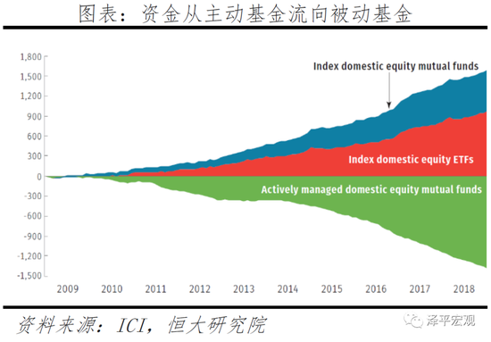 美国被动投资的发展得益于市场条件和金融创新。1)美股长牛。量化宽松政策向市场注入廉价流动性,催生美股长牛,呈现低波动上涨趋势,吸引大量被动投资者力图复制市场走势,获取市场平均收益。2)资本市场有效性提升。经过多年市场博弈,当时的美国股市越来越有效,获取超额收益的难度加大,而被动投资成本低廉,相对回报更高,1994-1996年91%的股票基金的收益增长率低于标准普尔500指数增长率。股神巴菲特曾指责基金经理收费太高,吞噬了投资者的收益,并建议普通投资者投资指数。3)ETF金融创新极大便利被动投资。ETF被设计为买卖一篮子股票,最初是为缓解股市崩盘时流动性不足问题,但其透明度、流动性、风险分散等特征迎合被动投资理念,1999-2018年ETF规模从340亿美增长到3.3万亿美元。