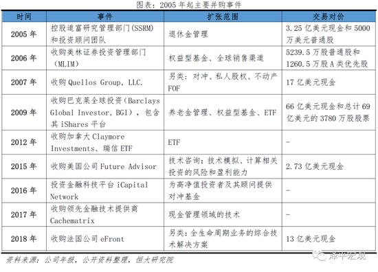 3)外延并购 (2005至今):乘被动投资东风,逆势扩张。这一时期美国主动型基金收益快速下滑,低成本的被动投资兴起,贝莱德借助ETF东风,一是通过一系列资本运作逆势扩张,2005年收购道富研究与管理(SSRM),实现从固收类产品拓展到权益类产品;2006年与美林资管(MLIM)合并,引入大量机构投资者,资产规模翻倍;2009年斥资135亿收购巴克莱全球投资者公司(BGI),获得旗下全球最大的ETF交易平台iShares,从主动管理转移到被动投资,资产规模从1.3万亿跃至3万亿美元,成为全球第一大资产管理公司。二是转危为机,将阿拉丁系统推向全球,2008年次贷危机使众多大型金融机构深陷破产之际,贝莱德不但免受波及,而且还成为美国政府清理有毒资产的专家顾问,名声大振。三是修炼内功,引领行业变革。资管规模已经位居世界第一的贝莱德并没有停止创新步伐,2011年向卖方业务延伸,如成立小型资本市场、启动内部交易平台以降低对经纪商依赖、启用人工智能、积极在ESG领域开展投资等。2005年-2019年,贝莱德管规模从4530亿美元增长至74296亿美元,年化增速达22%。