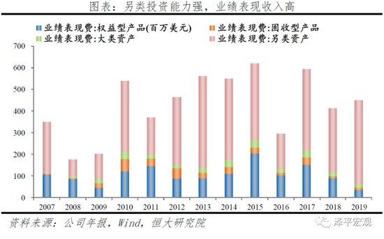 被动投资策略下,固定管理费为业务收入主要组成。贝莱德业务收入主要来自于投资咨询、管理费用和证券借贷,具体可划分为固定管理费、业绩表现、技术服务、产品分销、咨询及其他等。固定管理费基于资产管理规模收费,是主要收入形式,2008-2018年固定管理费服务占总营业收入的比例基本均超过80%,年均复合增长10.5%。2019年末,固定管理费收入为117.8亿美元,占比为81%,其次是产品分销收入、技术收入,分别达10.7、9.7亿美元,占比达7.3%、6.7%,而与主动管理更相关的业绩表现费仅占3.1%。