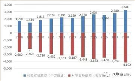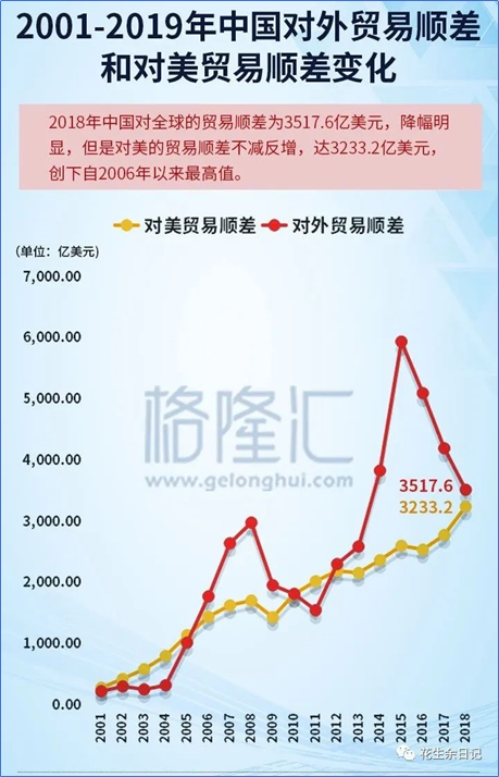 美国是中国最大出口国家,也一直是中国贸易顺差的最重要来源地。从1986年到2019年,中国从美国市场净赚54075亿美元。从1949年到2000年的五十年間,中国贸易顺差累计1352亿美元,而从2001年到2019年的十九年間,中国贸易顺差累计4.65万亿美元,新中国70年的外贸顺差总计是47852亿美元。由此可见,来自美国的贸易顺差比过去70年中国贸易顺差的总和还多6223亿美元。常年巨额的贸易逆差,也是中美贸易争端的根源所在。