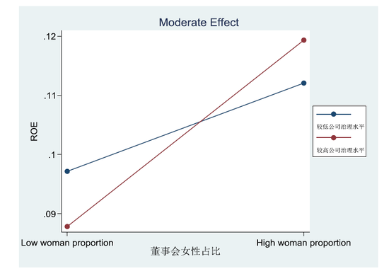 总的来说,结合实证研究与原因分析可知,董事会女性占比与其财务绩效水平之间存在显著正相关关系,并且公司治理水平对两者关系具有正向调节作用。这意味着对于治理水平较高的公司而言,增加董事会女性占比能较大幅度提升其财务绩效水平。