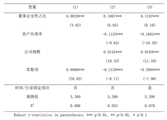 表1 董事会女性占比与ROE回归结果分析