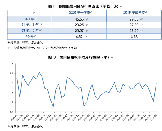 从发行期限结构来看,一季度1年以内(含1年)的短期债券发行占比较上季提高7.1个百分点,5年期以上长期债券占比略有提升,1-5年期(以3年期和5年期为主)的中期限债券占比有所下降。这与一季度短融发行火热相印证。不过,从月度来看,债券发行期限缩短的特征主要体现在2月,主要反映疫情冲击下,企业通过发行短期债券来缓和流动性压力的需求上升。3月注册制实施背景下,企业债、公司债发行量大幅增长,同时中期票据发行也有明显放量,整体发行期限明显拉长。根据我们的计算,按照债券最长期限统计,2月信用债加权平均发行期限为2.04年,较上月的2.41年缩短了约4.5个月,3月则拉长至2.99年。