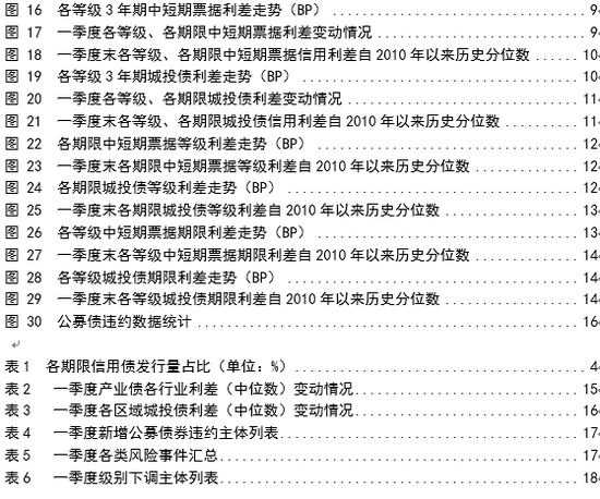 具体来看,产业债方面,季末1年期、3年期AA与AAA级中短期票据利差较上年末分别上行19bp和7bp,5年期AA与AAA级中短期票据利差则较上年末下行14bp(见图23);城投债方面,季末1年期、3年期、5年期AA与AAA级城投债利差较上年末分别上行17bp、6bp和7bp(见图25)。