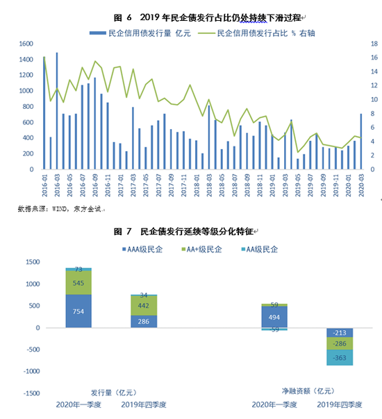 主要有两方面原因:一是在经历了前两年的违约潮之后,债券市场上有瑕疵的高风险主体数量已经明显减少。二是从政策层面来看,4.17中央政治局会议提到“六保”,“六保”之一为“保市场主体”,实际上就是要“保企业”,这也是保居民就业、保基本民生、保产业链供应链稳定的重要基础——避免出现新一轮“违约潮”是债市“保市场主体”的关键环节,债市融资环境改善将在一定程度上对冲发行企业经营端面临的压力。我们注意到,尽管疫情影响下,投资者风险偏好难言实质性回升,但一季度民企债发行规模有所放量,净融资实现转正,二级市场上民企债利差也有明显收窄,这也表明在较大力度的政策呵护下,民企同样有所受益。