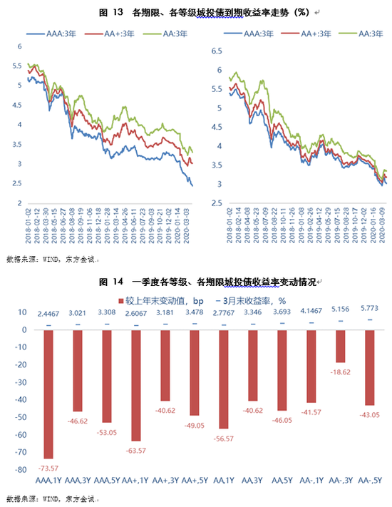 一季度信用债发行量3.08万亿,净融资额1.73万亿,较上年同期分别增长38.9%和156.7%,较上季分别增长25.8%和244.4%。其背后的主要推动因素有两个:一是监管推出债券发行“绿色通道”,支持企业通过债券融资缓解疫情造成的流动性压力;二是当季货币政策宽松力度显著加大,资金利率中枢快速下移,加之“资产荒”背景下,机构对信用债配置需求上升,债券发行利率明显走低。一季度民企债发行也有所改善,净融资实现转正。但政策利好仍主要体现在中高等级民企,低等级民企债发行依然困难。