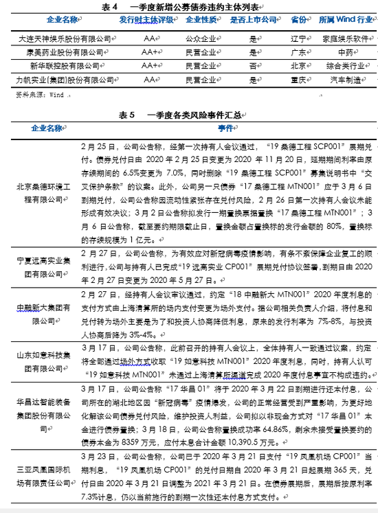 从新增违约主体数量看,疫情冲击下,一季度违约风险并未大幅暴露。但债券展期、场外兑付、取消回售、债券置换等各类风险事件频发(详见表5),同时,北大方正重整、政府工作组进驻海航、青海省投美元债危机等事件也引发市场广泛关注。相关主体多为自身即存在问题,并在疫情影响下加速其问题暴露,多个主体在公告中提及疫情造成公司流动性紧张,疫情影响下的信用风险上升趋势仍需关注。