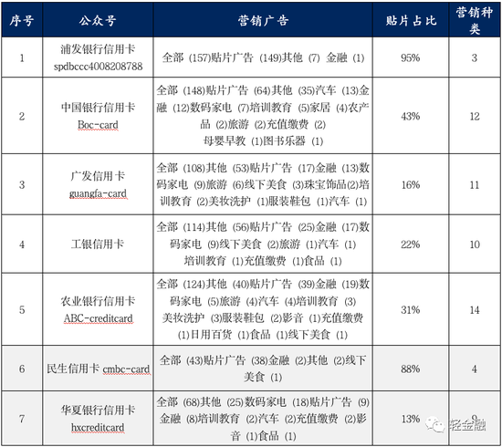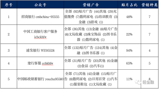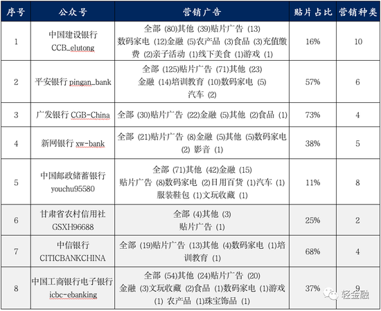3.信用卡类公众号更多采用种类非金融产品和服务营销,更少使用贴片广告方式营销