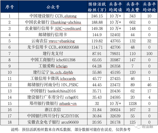 其次是农业银行,共有中国农业银行、农业银行信用卡两个公众号上榜,预估活跃粉丝338.26万。其中,中国农业银行预估活跃粉丝188.88万,头条平均阅读10万+,头条平均点赞662。