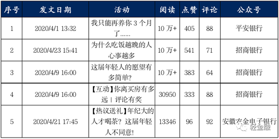 不过,也要看到一些“送礼”效果有所不同,比如建设银行广东省分行在世界读书日推出的“送书,还能领红包最高200元!”,在17689阅读量的情况下,点赞97,评论91;安徽农金电子银行4月21日的年轻人喝茶话题的“热议送礼”,在13346阅读量的情况下,点赞96,评论92,客户评论数远高于较多10万+活动。可能以后营销活动的“送礼”更要考虑“天时”(送礼的时机,比如读书日送书)“地利”(如区域下沉)“人和”(“撩”对客群)。