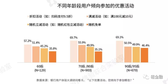 又如在对待优惠上,不同年龄段用户对优惠活动倾向是不一样的,比如90后/95后更倾向于随机免单方式带来的惊喜感,同时更注重优惠价值的大小而不是优惠的概率。“如果他搞那种什么随机立减活动,最高减999那种,那种我反而不会去用的。因为我碰到过那种随机立减的,每次都给我减一两分钱,感觉毫无意义”(上海用户,22岁)。在这种情况下,针对不同年龄段的客户优惠方案不同也才意味着营销服务的成功。这方面的招商银行和平安银行做得比较好,针对年轻人的煽情式营销效果较为突出。