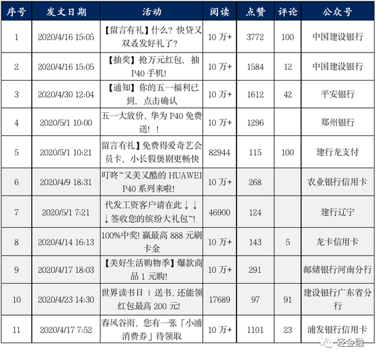 比如建行的“快贷又双叒发好礼了?”、“抢万元红包,抽P40手机!”,建行龙支付的“免费得爱奇艺会员卡”,平安银行的“你的五一福利已到,点击确认”,郑州银行的“五一大放价,华为P40免费送!!”,龙卡信用卡的“100%中奖!赢最高888元刷卡金 ”,邮储银行河南分行“爆款商品1元购!”,建设银行广东省分行的“世界读书日 | 送书,还能领红包最高200元!”,浦发银行信用卡“春风谷雨,您有一张‘小浦消费券’待领取”等等,获得了较高的打开阅读的欲望,客户阅读后点赞率高,积极参与留言评论(部分也有礼品的刺激作用)。