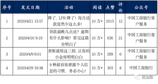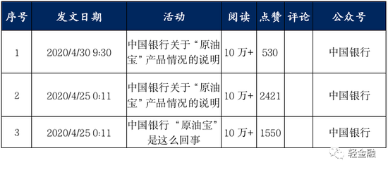 这包括对原来已有较大影响的产品新信息再认识,比如中国银行在4月下旬对“原油宝”产品情况的说明头条和次条均获得了10万+的阅读量,较高的点赞量。
