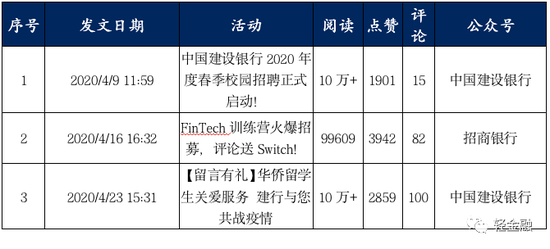 二是对客户自己或周围人未来可能产生较大影响的新服务推出。比如招商银行的“FinTech训练营火爆招募”,中国建设银行的“2020年度春季校园招聘正式启动”,也包括疫情期间中国建设银行的“华侨留学生关爱服务 ”。